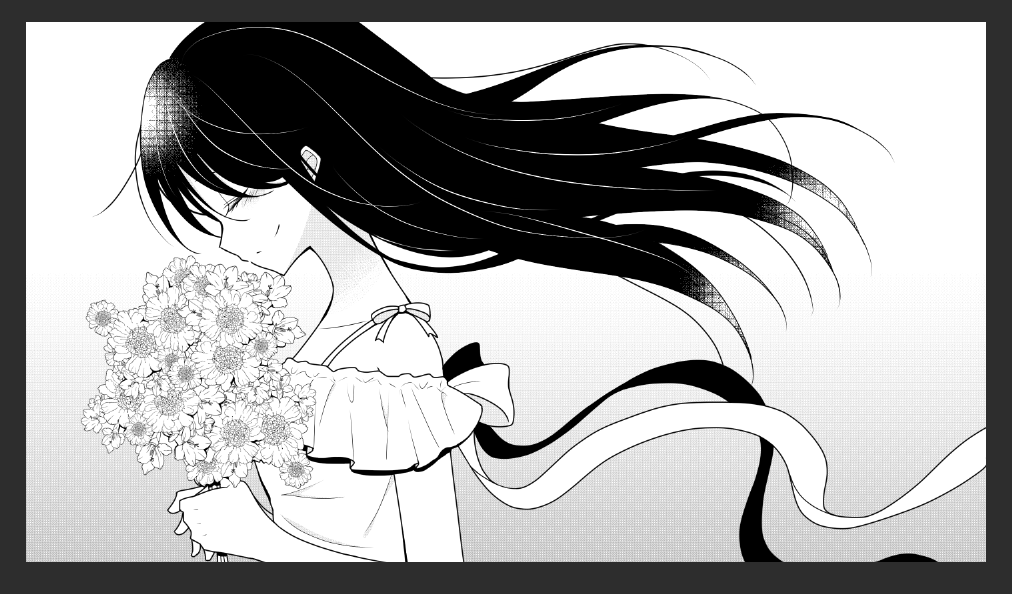 モノクロ二階調は、 白・黒のみ を使い、グレーは トーン(網点) を使って表現します。 普段デジタルで描いている方が間違えやすいのが、主線の描き方です。 Web用のイラストの主線は、全体にアンチエイリアスがかかっていて滑らかに見えますよね。
